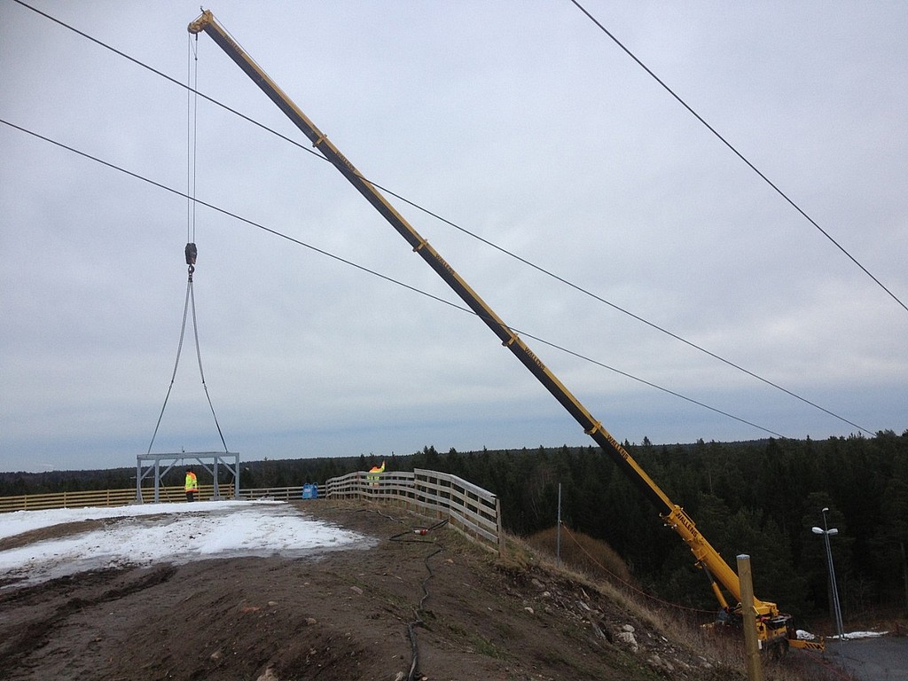Två montörer från Brynäs Mekano monterade ihop stålstativen under två dagar som byggeleverna på Polhem svetsat ihop. Lyfthjälp med stooor mobilkran hjälpte Walléns kranar till med. Alla ställde upp gratis.